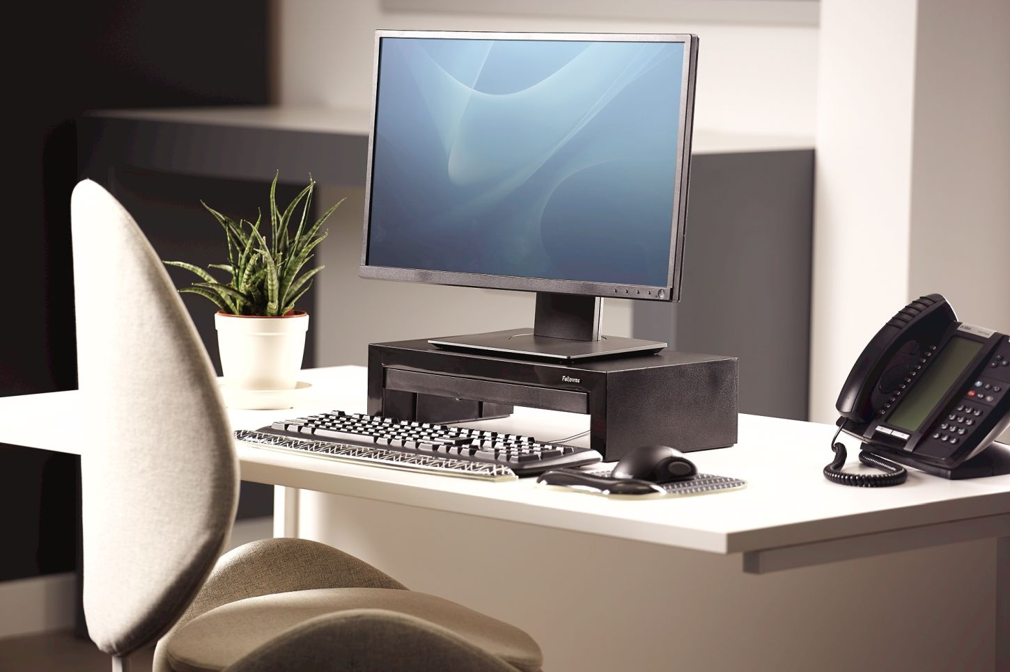 Používáním stojanu pod monitor Fellowes Designer Suites předcházíte bolesti šíje a krční páteře. Umožňuje nastavení monitoru do úrovně očí, čímž zmírňuje svalové napětí ramen a krku. Vhodné do kanceláře i domácnosti.