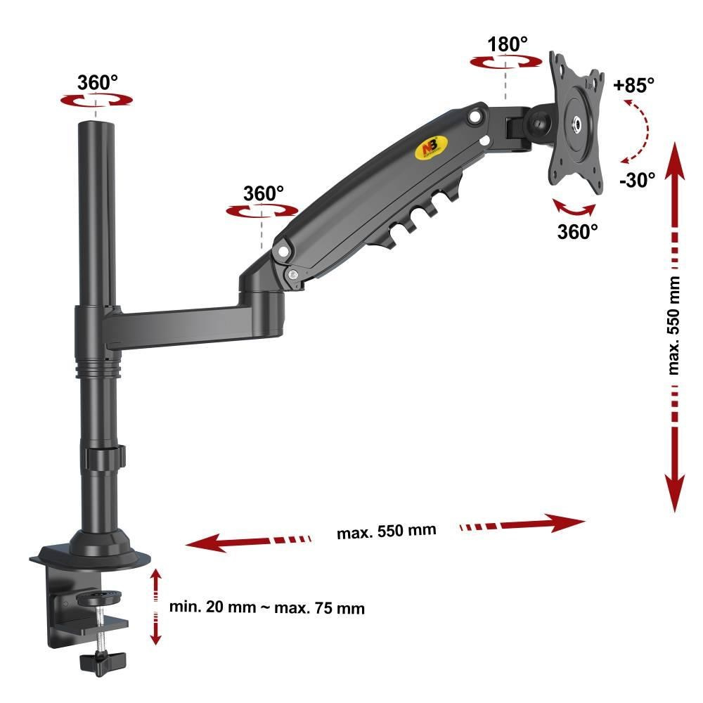 Stolný kancelársky držiak na monitor NB H80B Stolný držiak na monitory 17-27", plne nastaviteľný, TOP kvalita a dizajn, otáčanie do strán, naklápanie, vysúvanie, PIVOT, VESA 75/100, nosnosť 9kg Špičkový stolný držiak s uchytením na okraj alebo do priestoru stola. VESA štandard 75x75 a 100x100 pre uchytenie monitorov s uhlopriečkou 17-27". Držiak umožňuje úplnú nastaviteľnosť polohy monitoru: otáčanie do strán, duálne výškové polohovanie, naklápanie, vzdialenosť od uchytenia a rotáciu monitoru. Rameno držiaka je osadené plynovým piestom s nastaviteľnou tuhosťou 2-9kg, výškové polohovanie je teda extrémne jednoduché a pohodlné. Farebné prevedenie čierne, záruka 3 roky. Stolný držiak monitoru na okraj stola alebo do priestoru stolovej dosky, nosnosť 9kg, VESA 75x75 a 100x100, úplné 3D nastavenie polohy monitora, profesionálna kvalita - NB H80B Technické údaje: zaťaženie: minimálne 2kg, maximálne 9kg na monitory s uhlopriečkou 17" až 27" VESA štandardy 75x75 a 100x100 duálne výškové polohovanie (ramenom s piestom + objímkou na nosníku) nastavenie výšky od stolu 0-550mm otáčanie do strán +360° / -360° sklápanie +85° / -30° rotácia obrazovky - na šírku alebo na výšku dva typy uchytov na stolovú dosku (na okraj stola alebo do priestoru stolovej dosky) uchytenie na stolovú dosku o priemere 20-75mm systém na usporiadanie káblov farebné prevedenie čierne záruka 3 roky Profesionálny stolový držiak na monitor NB H80B Držiak monitora NB H80B podporuje VESA štandardy: VESA 75x75 VESA 100x100 Profesionálna kvalita, krásny dizajn a extrémna nastaviteľnosť - to všetko za cenu strednej triedy stolových držiakov. Popis produktu bol preložený pomocou umelej inteligencie a môže obsahovať nepresnosti.