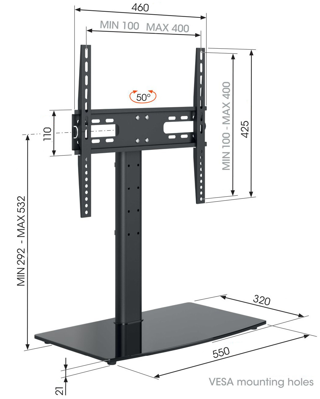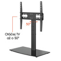 Praktický a flexibilní Díky základové desce o rozměrech 55 x 32 cm nepotřebujete tak širokou televizní skříňku jako u běžných televizních podstavců. Základní deska je vyrobena z tvrzeného skla a zajišťuje mimořádnou stabilitu televizoru. Při instalaci si sami zvolíte výšku, ve které chcete televizor namontovat. Televizor můžete snadno natočit až o 50° směrem na své oblíbené křeslo.