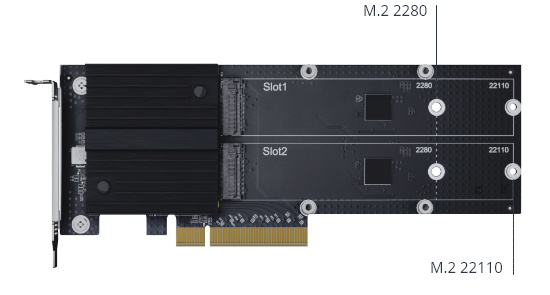 Synology M2D20 je karta adaptéru M.2 NVMe SSD určená k navýšení výkonu vstupu/výstupu zařízení NAS. Schopnost zpracování více front disků NVMe SSD významně napomáhá v aplikacích citlivých na latenci, jako je indexování fotografií, hledání souborů a nasazení virtualizace.