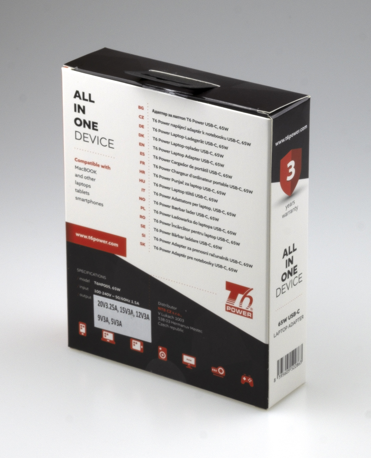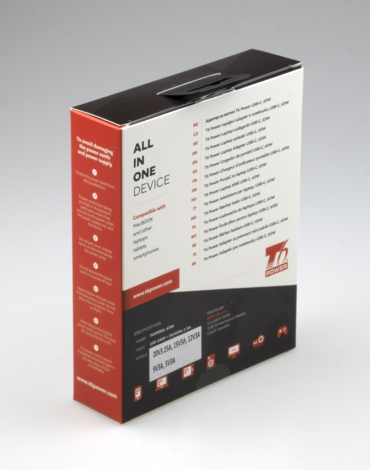 Univerzální adaptér značky T6 Power s výkonem 65 W je ideálním zdrojem energie pro notebooky, ultrabooky, MacBooky, tablety, mobílní telefony, monitory, atd.