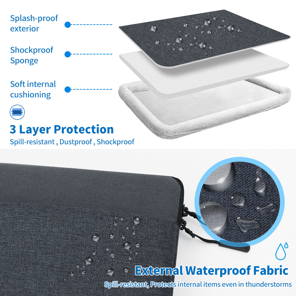 Taška je vyrobena ze tří vrstev textilie - vnější voděodolný materiál, střední nárazu vzdorný materiál a vnitřní měkký materiál. Díky těmto třem textiliím máte jistotu, že je vaše zařízení v bezpečí za všechn okolností. Rohy brašny jsou navíc opatřeny ochranou rohů zařízení.