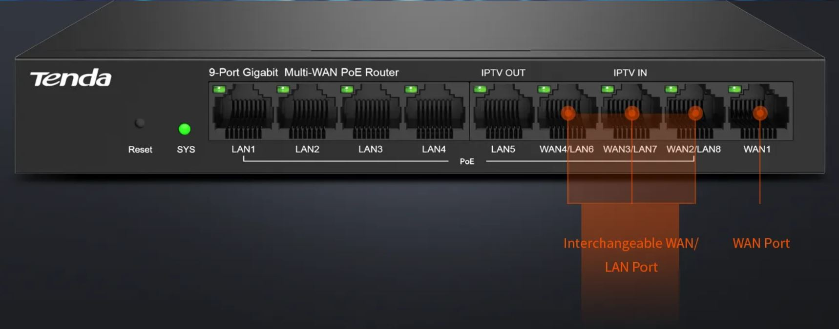 Popis Tenda G0-8G-PoE Gigabit PoE Router MultiWAN, 3x GWAN/GLAN, 1x GWAN, 5x GLAN, 8x PoE 802.3af/at, VPN