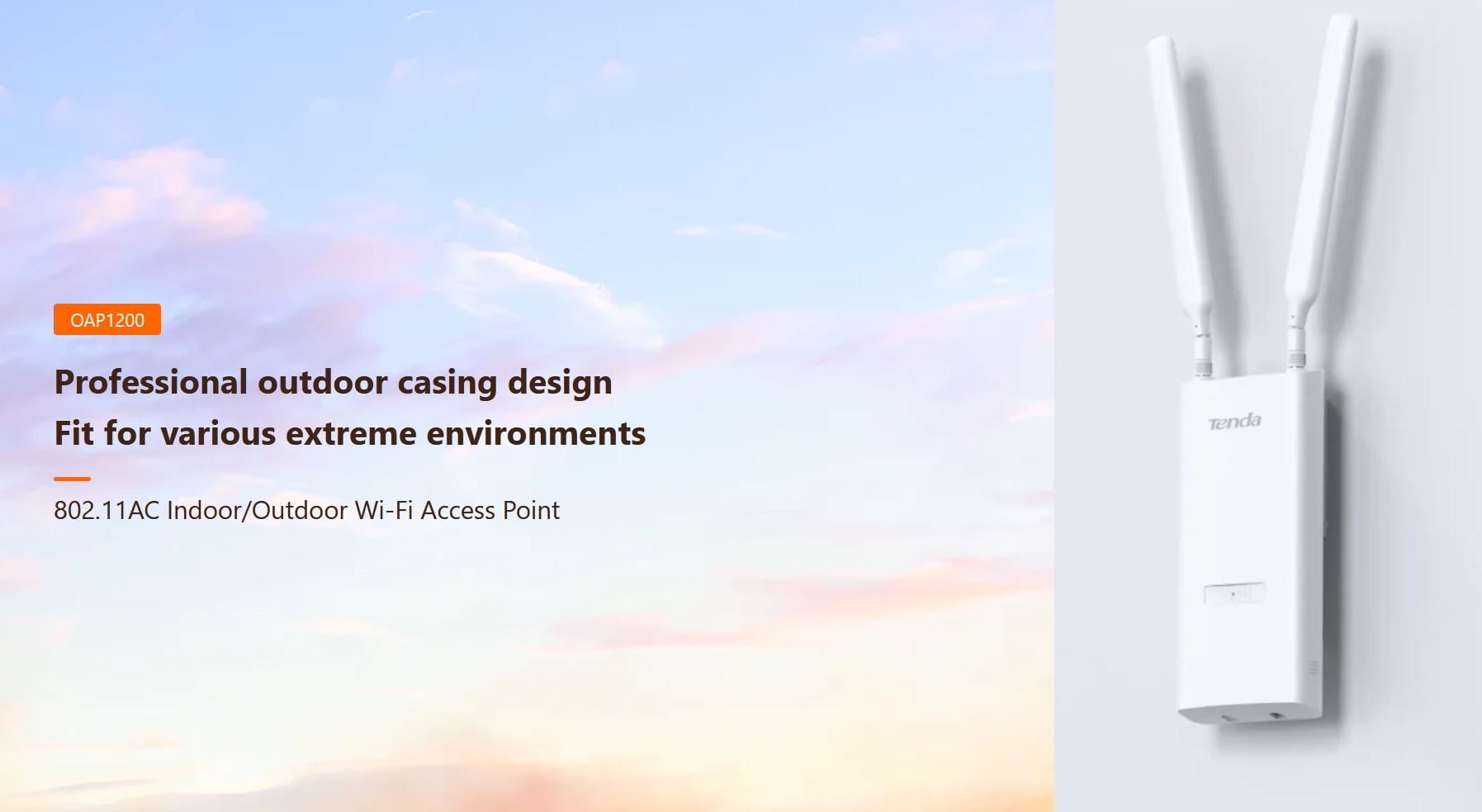 Tenda OAP1200 je bezdrátový Wi-Fi přístupový bod (Access Point) pro venkovní i vnitřní použití, podporuje standardy 802.11ac(wave2)/a/b/g/n v pásmu 2,4 a 5 GHz s rychlostí až 1167 Mb/s s technologií MU-MIMO, OFDMA, Beamforming. Podporuje rychlý přechod klientů Fast roaming 802.11 k/v/r. Obsahuje 1x Gigabitový LAN port, který podporuje aktivní PoE 802.3af napájení ale také pasivní napájení (24V 0,5A). Podpora 12x SSID (8x 2,4 GHz + 4x 5GHz), VLAND tagging, AP Isolation a další technologie, připojení až 256 klientů. Obsahuje držák pro umístění na stěnu, strop, sloup apod.