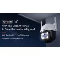 Venkovní otočná IP kamera s online sledováním pomocí mobilního telefonu a tabletu. Ukládání záznamů a fotografií na microSD kartu nebo Cloud. Rozlišení 4MP pro video ve vysoké kvalitě, denní i noční provoz díky IR dosvitu až 30 m, ohnisková vzdálenost 4,0 mm, Wi-Fi b/g/n, 1x LAN RJ45 10/100 Mb/s, mikrofon a reproduktor, slot pro microSD kartu s velikostí až 256 GB. Úhel záběru 360° horizontálně a 137° vertikálně. Kamera podporuje detekci pohybu, detekci osoby, a automatické otáčení za pohybem/osobou. Součástí balení je držák na stěnu/strop.