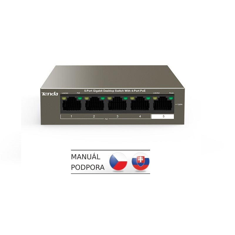 Tenda TEG1105P-4-63W je 5ti portový Gigabitový Ethernet PoE switch s napájením PoE af/at. 4 porty 10/100/1000 Mb/s jsou napájeny pomocí PoE 802.3af/PoE 802.3at (celkem 4 porty 63 W) a pátý port Uplink. Kovový obal.