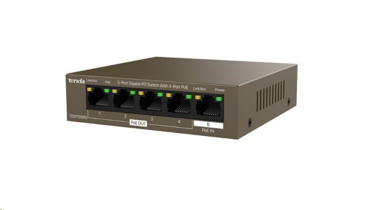 Popis Tenda TEG1105PD - 5-portový PoE PD Gigabit Ethernet Switch, 1x PoE IN, 4x PoE OUT, kovový, bez ventilátora