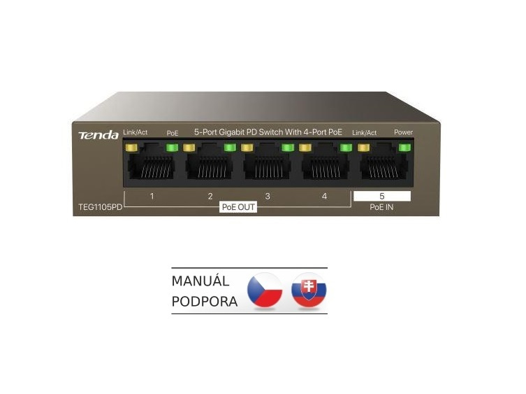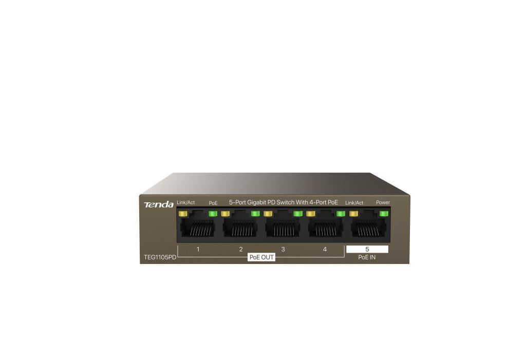 Tenda TEG1105PD je 5ti portový Gigabitový Ethernet PoE switch. Je napájený pomocí PoE a zároveň napájí další zařízení pomocí PoE. 1 port je pro napájení switche a další 4 PoE porty 10/100/1000 Mb/s podporují PoE 802.3af (celkem 4 porty 30 W). Fanless, bez ventilátoru.