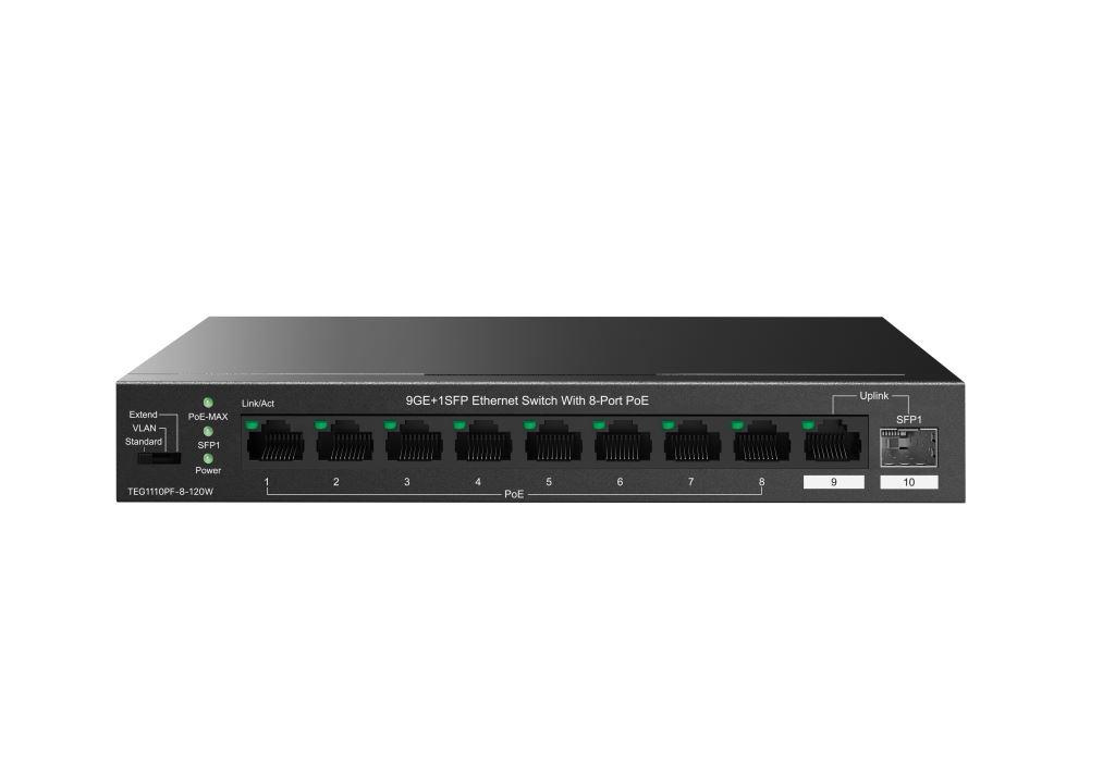 Popis Tenda TEG1110PF-8-120W PoE+ AT switch 8xPoE 802.3af/at + Uplink RJ45 + SFP port, 110W, PoE+, fanless