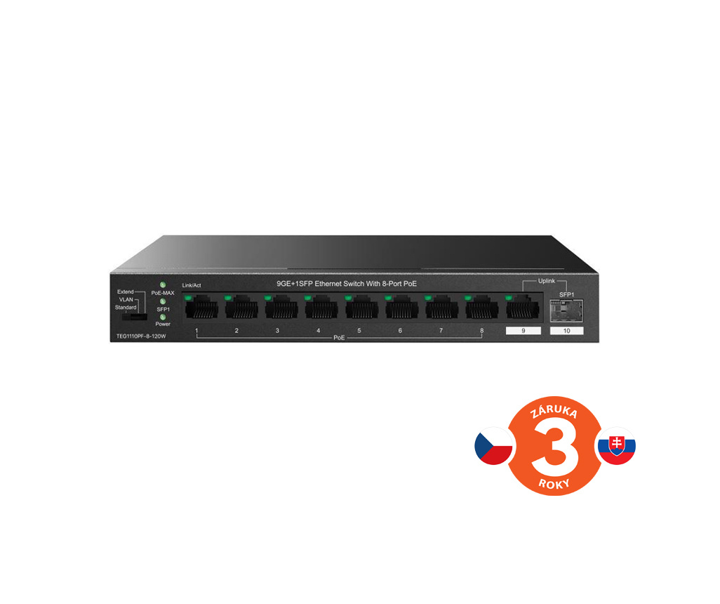 Tenda TEG1110PF-8-120W přepíná data pomocí 9 portů RJ45 a optického SFP slotu. 8 portů 10/100/1000 Mb/s podporuje napájení PoE802.3af/at, další 1 port RJ45 10/100/1000 Mb/s a SFP slot s rychlostí 100/1000 Mb/s jsou určeny pro Uplink. SFP moduly doporučujeme značky Signamax. Switch má ochranu proti přepětí 6kV. Podpora přepojování uzlů v módu Store-and-Forward. Full-duplex kontrola toku 802.3x, half-duplex kontrola toku v režimu Back-Pressure.