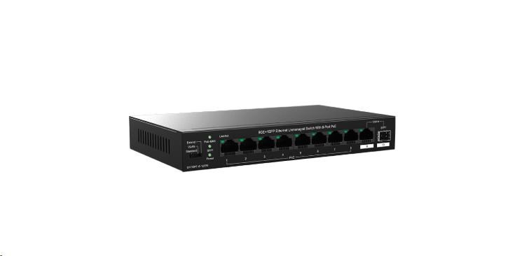 Funkcie: Jedným tlačidlom zmeníte režim siete: 1. Štandardný: Výchozí režim. V tomto režime môžu všetky porty navzájom komunikovať. 2. VLAN: V tomto režime sú porty 1 - 8 od seba izolované, ale všetky môžu komunikovať s portami 9 a SFP1. Tento režim pomáha izolovať všesmerové vysielanie DHCP a obmedziť zahltenie všesmerovým vysielaním. 3. Rozšíriť: V tomto režime porty 1 - 8 znižujú vyjednávaciu rýchlosť na 10 Mbps, ale prenášajú až na vzdialenosť 250 m. Všetky porty môžu navzájom komunikovať