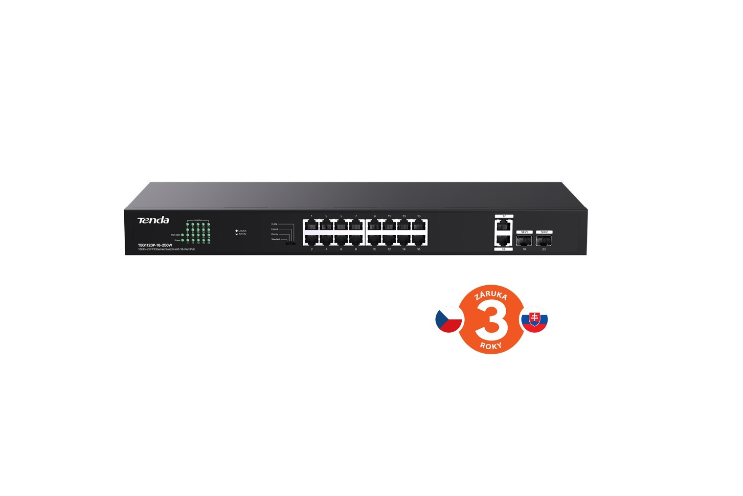 Popis Tenda TEG1120P-16-250W PoE+ Gigabit switch 16x 1Gb/s PoE+ 802.3af/at + 2x SFP + 2x RJ45, 230W, Rack