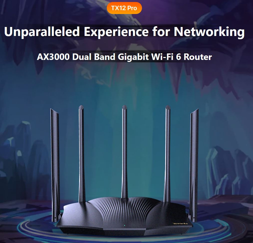 Popis Tenda TX12 Pro AX3000 WiFi6 Router, 1x GWAN, 3x GLAN, IPv6, 5x 6dBi, WPA3, Mesh, CZ app