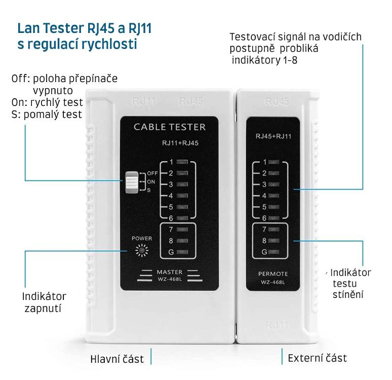 W-Star Tester káblov UTP WS468WH RJ45 RJ11 STP Cat5e Cat7 biela