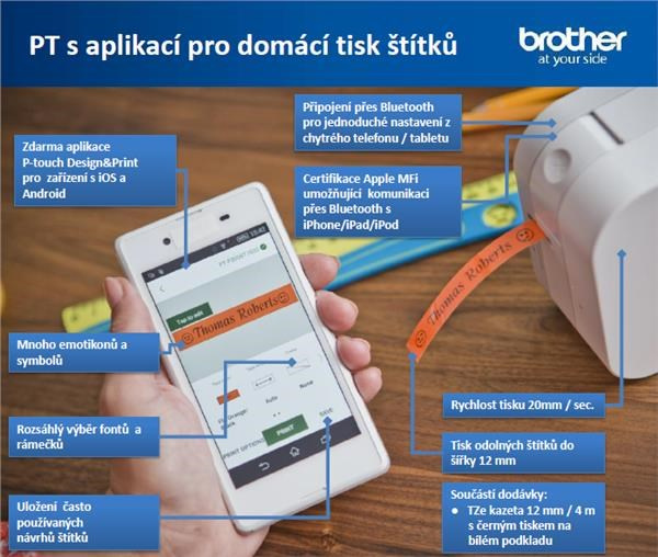 Popis Tlačiareň štítkov BROTHER PT-P300 - 12 mm, TZe pásky, BT, iOS 9, Android 4.1 a vyššie, Apple MFi, BT ver. 2.1, 20 mm/s
