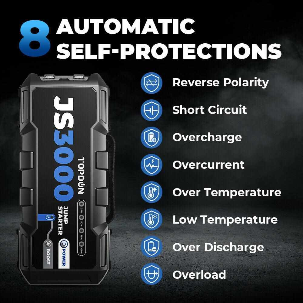 S úžasným výkonom 3000A nastartuje Váš dopravný prostriedok pri vybitej batérii až do maximálneho objemu 7.0L pre naftové motory a 9.0L pre benzínové motory a to opakovane v závislosti od objemu Vášho motora. Tento car jump startér môžete používať pre pohotovostné štarty nielen vozidiel, ale aj motocyklov, skútrov, lodí, štvordverových áut, snehových skútrov, karavanov, osobných i nákladných vozidiel s 12V okruhom, atď.