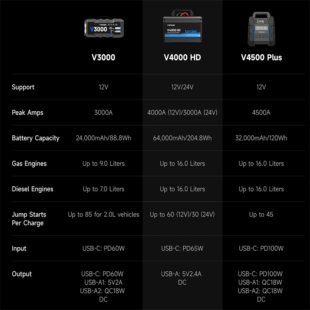 Popis TOPDON Car Jump Starter V4000 HD/3000A (24V)/4000A (12V)/24000mAh/16l benzín/16l diesel/ LED svetlo |