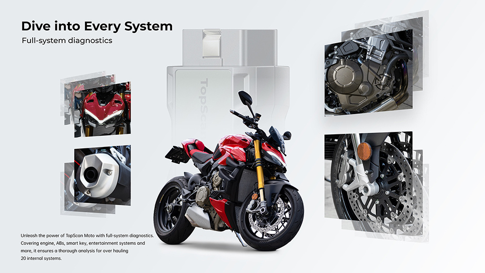 Uvolněte sílu systému TopScan Moto s diagnostikou celého systému. Zahrnuje motor, ABS, inteligentní klíč, zábavní systémy a další a zajišťuje důkladnou analýzu pro generální opravu 20 vnitřních systémů. Komplexní přístup zajišťuje přesné řešení problémů.