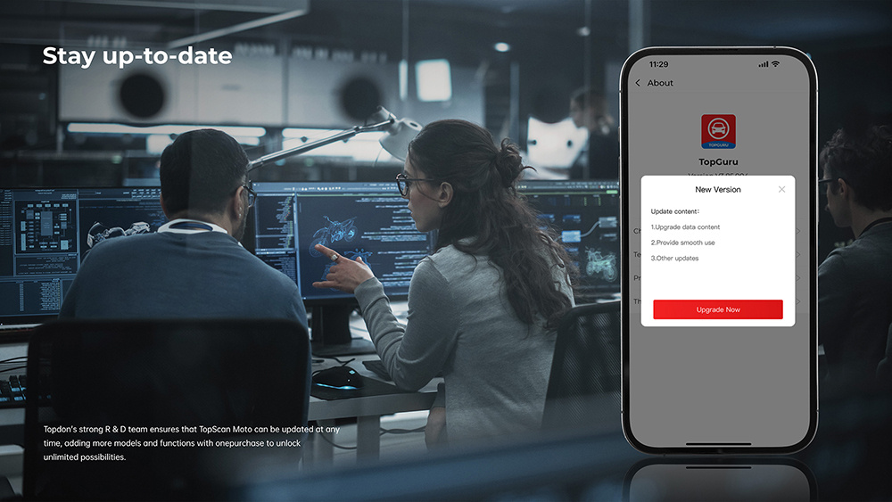 Díky inteligentním funkcím, jako je aktivní test, skenování jedním kliknutím, bezdrátové připojení a intuitivní rozhraní, je navržen pro pohodlí na cestách. Mějte náskok díky online aktualizacím aplikace a přispívejte k neustálému zlepšování prostřednictvím integrace citlivé zpětné vazby. TopScan Moto není jen diagnostický nástroj; je to důvěryhodný společník vašeho motocyklu pro dosažení špičkového výkonu při každé jízdě.