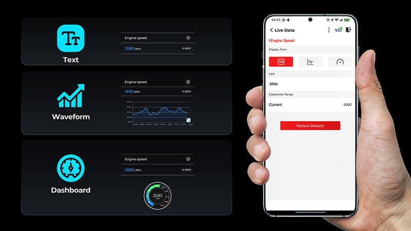 Zobrazení datových toků ve formě textu, grafu nebo grafu podobného přístrojovému panelu. To pomáhá uživatelům intuitivně sledovat změny dat v čase. Použití funkce "Kombinovat" pro grafické zobrazení až 4 datových toků v jednom rozhraní umožňuje uživatelům vyhodnocovat výkonnost pomocí srovnávacích dat a dělat přesná a efektivní rozhodnutí.