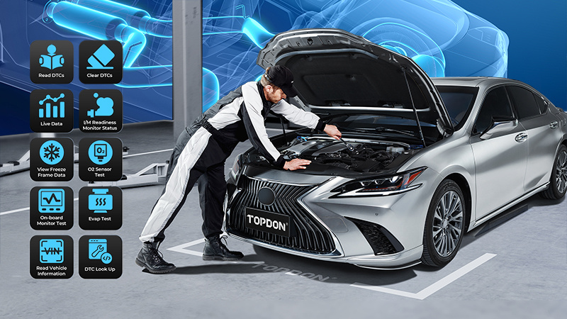 Přístroj TopScan Pro od společnosti TOPDON funguje jako čtečka kódů OBD2 a provádí všech 10 režimů testování OBD2 zdarma po celou dobu životnosti, což vám umožní přístup k důležitým informacím o ještě více vozidlech. Podporuje také všechny funkce, včetně čtení DTC, vymazání DTC, živých dat, stavu monitoru připravenosti I/M, zobrazení dat Freeze Frame, testování snímače O2, testování palubního monitoru, testování výparů, čtení informací o vozidle a vyhledávání DTC.