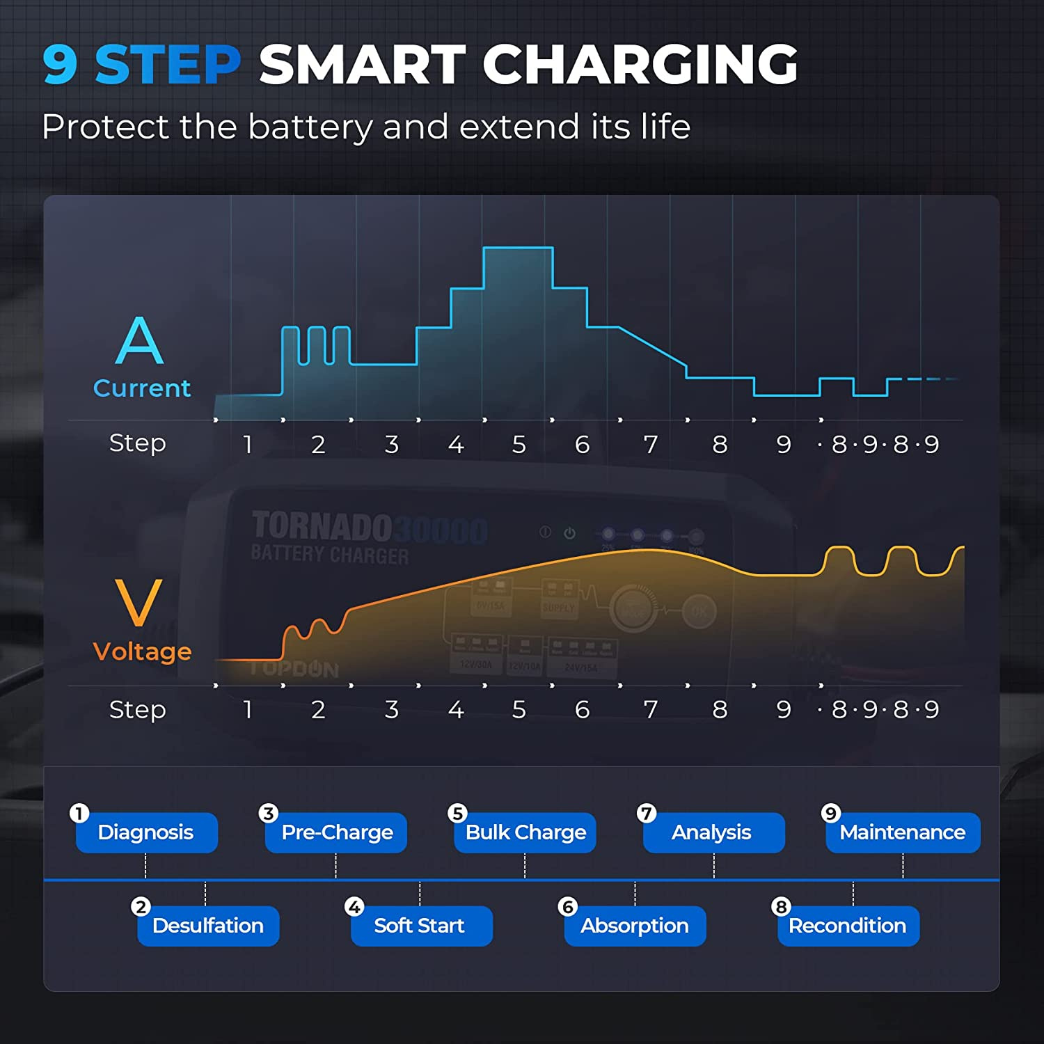 Nabíječka autobaterií TOPDON TORNADO 30000 Tato profesionální nabíječka autobaterií je vhodná pro většinu typů baterií (AGM, LI WET, GEL, MF CAL a EFB) se špičkovým výkonem 360W! Kompatibilní s 6V, 12V i 24V bateriemi, se třemi možnostmi nabíjecího proudu 10A, 15A a 30A. TORNADO 30000 je vytvořena jak pro osobní, tak pro komerční užití. Dokáže oživit, opravit a dobít jak lithiové, tak lead-acid baterie. Také ale dokáže sloužit jako stabilní napájecí zdroj při opravách, testování nebo diagnostice automobilu bez nutnosti startování vozidla. S jeho 9stupňovým, chytrým nabíjením a s jeho 12 nabíjecími módy, poskytuje TORNADO30000 bezkonkurenční možnost nabíjení a ochrany pro svého uživatele. 9stupňové chytré nabíjení 9stupňové chytré nabíjení poskytuje silnou ochranu baterie a automatický systém odpojení eliminuje risk přebití. Používejte NORM (běžné)/COLD (v chladu)/REPAIR (oprava) módy, abyste se přizpůsobili potřebám Vaší baterie a tím prodloužili její životnost. Napájecí zdroj, který Vám dodá energii Tornado 30000 také funguje jako stabilní napájecí zdroj pro 12V a 24V zařízení! Napětí vozidla můžete udržovat na 12 V, abyste zabránili vybití při provádění oprav. S Tornado 30000 tak získáte bezpečný napájecí zdroj, který se vyhýbá provozním zpožděním, nestabilitě zařízení a poruchám. Jedno zařízení, které zvládne vše! Díky podpoře 6V, 12V a 24V baterií je tato nabíječka vhodná pro více typů baterií, včetně AGM, LI WET, GEL, MF CAL a EFB! Tornado 30000 nabízí 3 nabíjecí proudy 30A, 15A a 10A. Tato inteligentní nabíječka baterií dokáže diagnostikovat a opravit širokou škálu problémů s bateriemi, včetně zrychlení napájení a vnitřního odporu. Současně to je také sofistikované zařízení pro udržování optimální kapacity baterie, nabíječka a desulfátor v jednom. TORNADO 30000 dokáže automaticky detekovat sulfataci baterie a stratifikaci kyseliny a pomocí funkce pulzní opravy obnoví ztracený výkon baterie pro silnější startování motoru a prodloužení životnosti baterie. Až 12 nabíjecích programů Buďte vždy připraveni na práci s 12 nabíjecími režimy pro každou situaci. Toto výkonné zařízení je dokonce schopné nabíjet několik baterií současně! Pracujte za jakýchkoliv podmínek Vestavěné teplotní senzory a chlazení ventilátorem chrání TORNADO 30000 a automaticky mění nabíjecí výkon podle teploty. Pracovní teplota: -10?~40? (14°F~104°F) Ještě více ochrany! Tornado 30000 dokáže ochránit Vaši baterii proti: přepólování zpětnému nabíjení zkratu přehřátí přepětí Bezpečné každodenní používání zajišťuje jeho odolné pouzdro z ABS, které má samohasící účinky a svorky zabraňující jiskření! Technické specifikace: Vhodné pro baterie: 50 - 1000Ah Vstupní napětí AC 100-240VAC, 50-60Hz Pracovní napětí AC 100-240VAC, 50-60Hz Účinnost 85% přibližně Výkon 360W Max Nabíjecí režimy 12V30A(NORM/LI/REP) 24V15A(NORM/COLD/LI/REP) 6V15A(NORM/REPAIR) SUPPLY 12V30A/24V15A 12V10A(NORM) Detekce nízkého napětí 2V(24V), 2V(12V), 2V(6V) Obvod zpětného proudu < 5mA Délka nabíjecího kabelu 2m Rozměry produktu 205,4x71,7x46,5mm Hmotnost 2 800g Materiál ABS IP ochrana IP20 - chlazeno vestavěným větrákem Příslušenství Krokosvorky, konektor s očkem Pracovní teplota -10°C to 40°C Ochrany Ochrana proti přepólování, jiskření, přebíjení, nadproudy, otevřenými obvody, zkraty a přehřátím