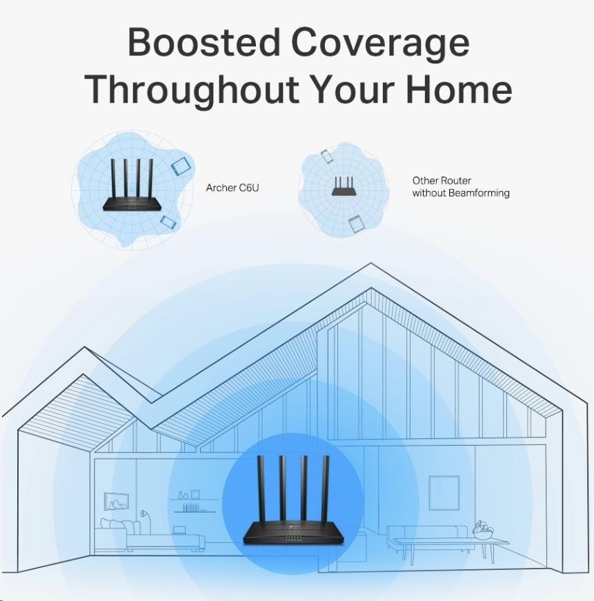 Archer C6U vytvára spoľahlivú a rýchlu sieť s technológiou Wi-Fi 802.11ac. Pásmo 2,4 GHz ponúka rýchlosti až 300 Mb/s, je pripravené na každodenné úlohy, ako je odosielanie e-mailov a prehliadanie webu, zatiaľ čo pásmo 5 GHz poskytuje rýchlosti až 867 Mbit/s, je ideálne na streamovanie videa v HD a online hranie bez oneskorenia.