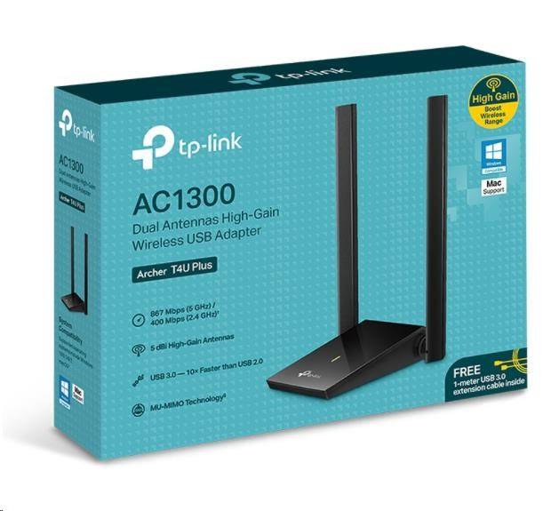 | Balenie obsahuje | AC1300 Dual Antennas High-Gain Wireless USB Adapter Archer T4U Plus Rýchla inštalačná príručka Resource CD 1-meterový USB 3.0 kábel |