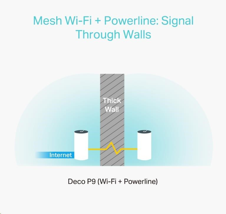 Deco P9 kombinuje duálne Wi-Fi a powerline pre vytvorenie silnejšej mesh siete. Technológia Powerline využíva elektrické rozvody vášho domu na vytvorenie silnejšieho prepojenia medzi jednotkami Deco tým, že znižuje dopad stien a iných prekážok na signál a poskytuje ešte vyššie rýchlosti siete a naozaj bezproblémové pokrytie .