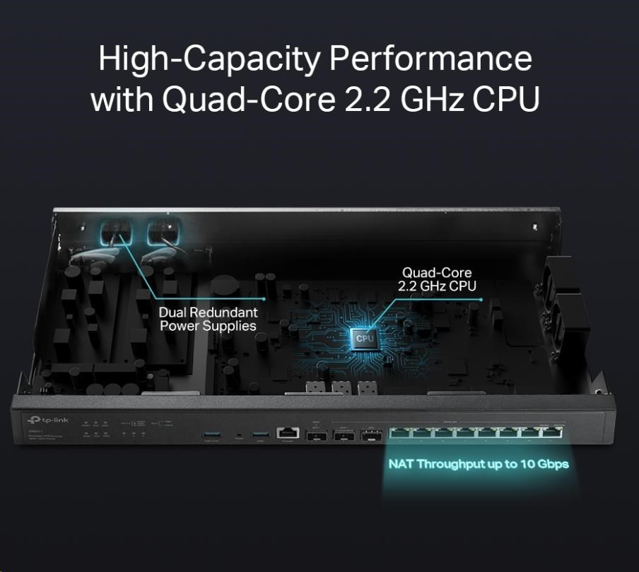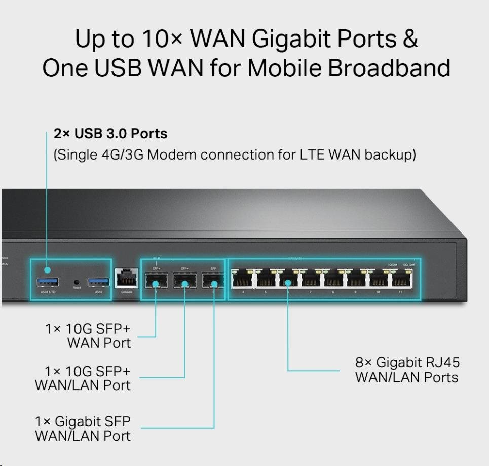 Popis TP-Link ER8411 OMADA VPN router (2xSFP+(1xWAN,1xWAN/LAN),1xSFP WAN/LAN,8xGbELAN/WAN,1xConsole,2xUSB3.0)