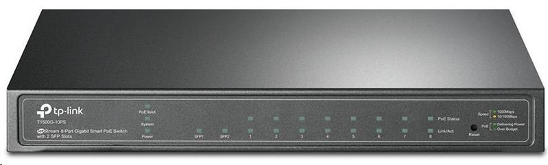 10portový gigabitový inteligentný switch s 8 portami PoE+ a 2 SFP portami