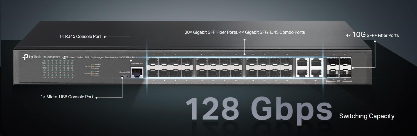 Bleskurýchle odchádzajúce pripojenie 10G - 4 sloty SFP+ s rýchlosťou 10 Gbit/s umožňujú vysoko prenositelnú širokopásmovú pripojenie a prepínaciu kapacitu bez blokovania.