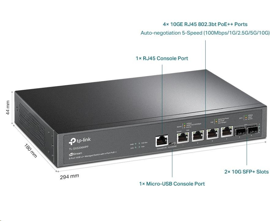 Popis TP-Link OMADA switch SX3206HPP (4x10GbE,2xSFP+,4xPoE++,200W,2xconsole)