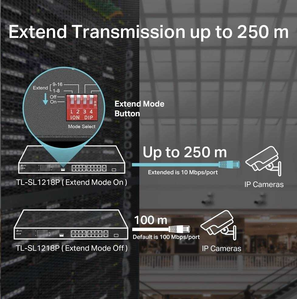 | Advanced Features | • Kompatibilný s IEEE 802.3at/af zodpovedajúcimi PDs • Extend Mode (až do 250m PoE napájania a prenosu dát) • Prioritný režim • Režim izolácie • Automatické učenie a auto-cca MAC adries • IEEE802.3x flow control |