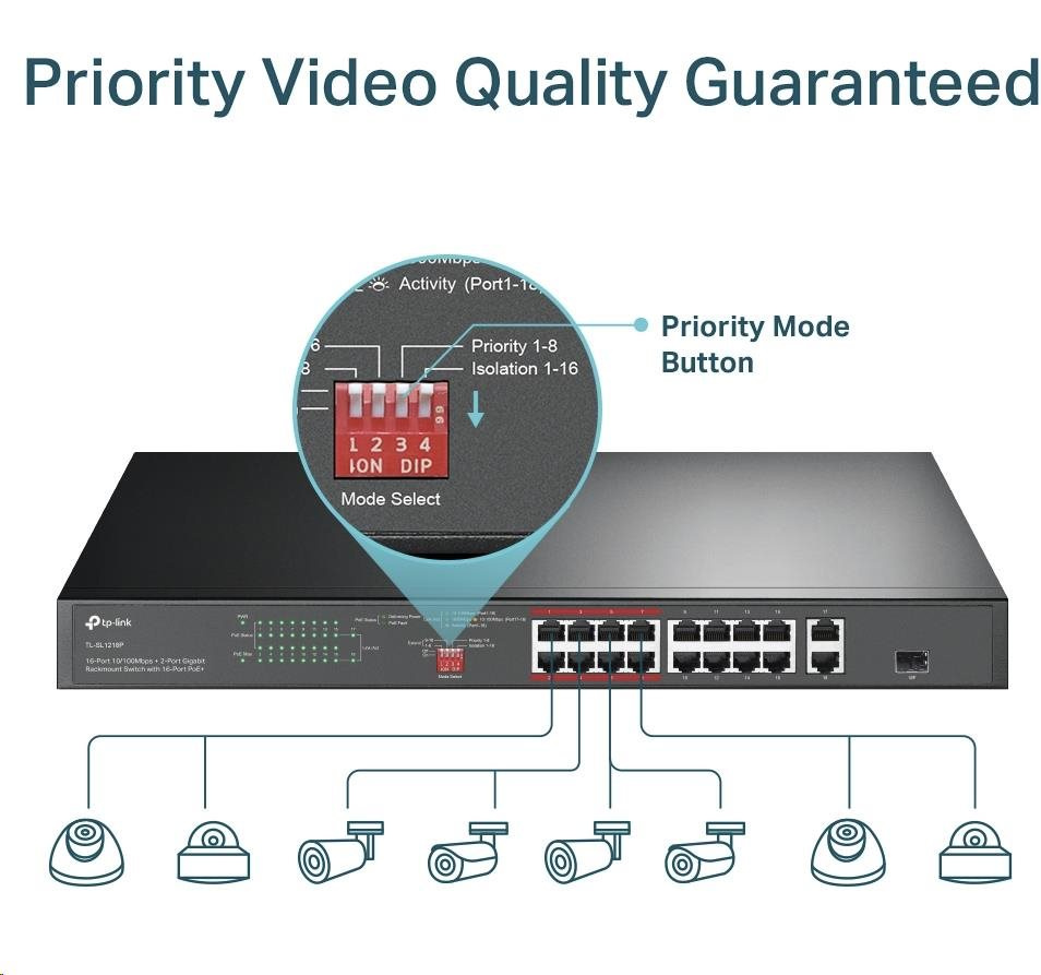 | Interface | • 16× PoE+ 10/100 Mbps RJ45 Portov • 2× 10/100/1000 Mbps RJ45 Porty • 1× Combo Gigabit SFP slot |