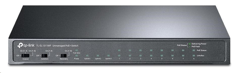 Popis TP-Link CCTV switch TL-SL1311MP (8x100Mb/s, 2xGbE uplink, 1xSFP, 8xPoE+, 124W, fanless)