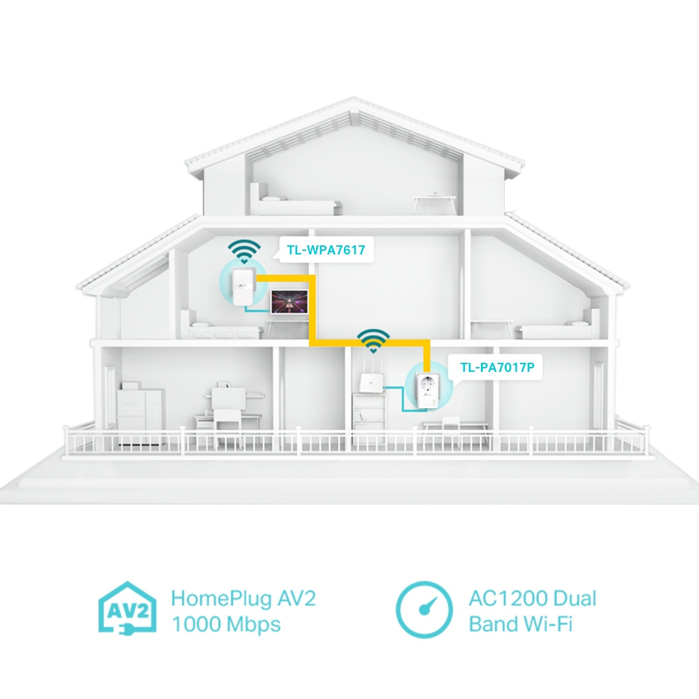 Sada adaptérů AV1000 Gigabit průchozí Powerline AC Wi-Fi. Snazší život s ultra rychlým opakovačem signálu Wi-Fi s využitím existující elektroinstalace. Adaptéry TL-WPA7617 KIT z řady produktů Powerline přemění vaši existující domácí elektroinstalaci v ultra rychlou síť a přivedou kabelové a bezdrátové sítě všude tam kde je elektrická zásuvka.