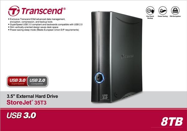 Popis Externý pevný disk TRANSCEND 3,5" USB 3.1 StoreJet 35T3, 8 TB, čierna, Turbo