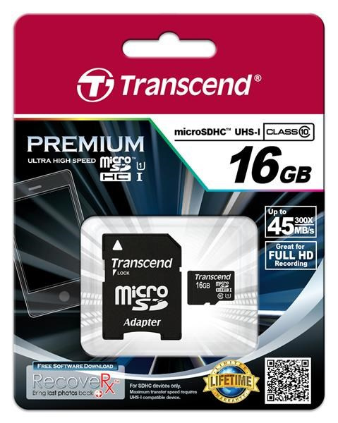 Popis Karta TRANSCEND MicroSDHC 16GB Premium, Class 10 UHS-I 300x + adaptér