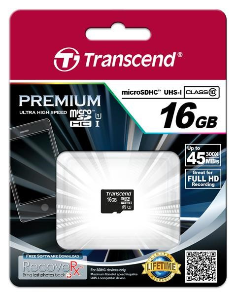 Popis Karta TRANSCEND MicroSDHC 16GB Premium, Class 10 UHS-I 300x, bez adaptéra