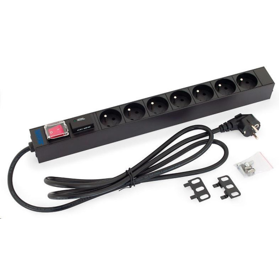 19" rozvádzač 1U; 7 x zásuvka podľa ČSN, max. 16 A; kábel 3 x 1,5 mm, 2 m + zástrčka univerzálna CZ-DE max. 16 A; bleskozvod; osvetlený spínač s bezpečnostným krytom; RAL 9005