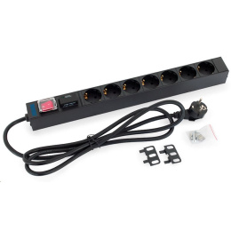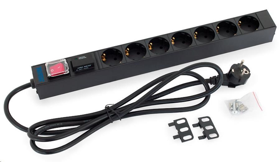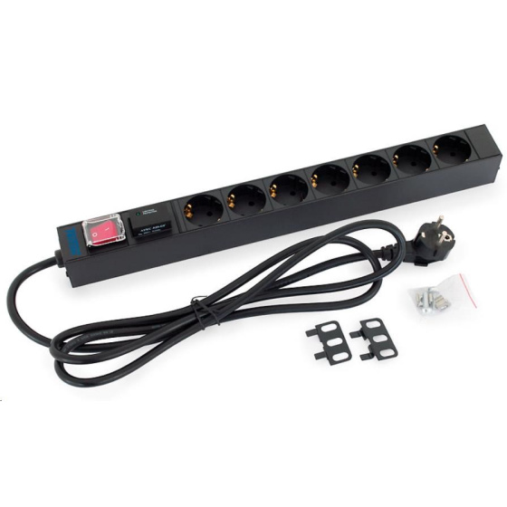 19" distribučný panel 1U; 7 x zásuvka DIN, max. 16 A; kábel 3 x 1,5 mm, 2 m + zástrčka univerzálna CZ-DE max. 16 A; bleskozvod; osvetlený spínač s bezpečnostným krytom; RAL 9005