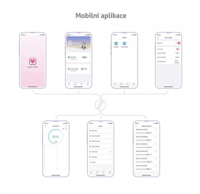 Vďaka zabudovanému Bluetooth možno teplomer spárovať s telefónom a hodnoty merania uchovávať v mobilnej aplikácii.