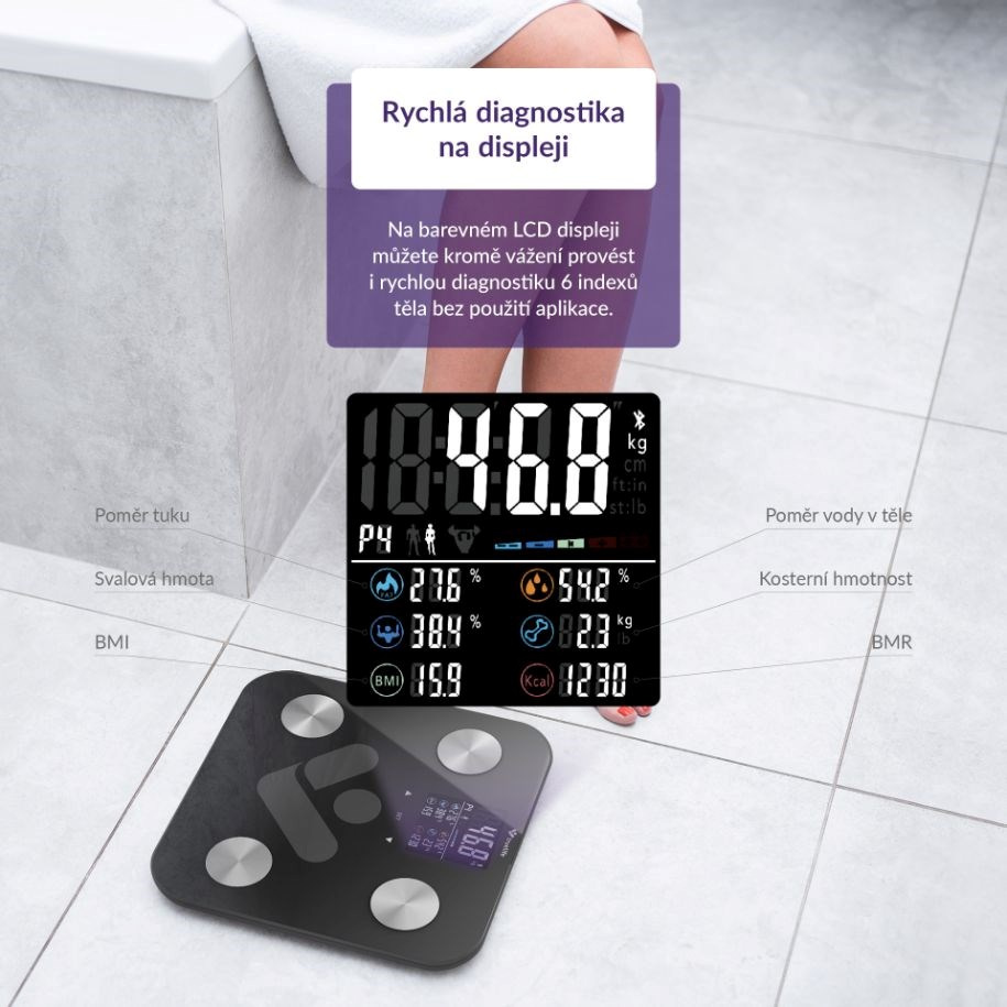 Predstavte si osobnú váhu tak šikovnú, že vám umožní dokonale poznať vlastné telo. TrueLife FitScale W6 BT Black to dokáže. Veľmi presne ukáže vašu aktuálnu hmotnosť a pridá kopu ďalších užitočných informácií vďaka bioelektrickej impedančnej analýze. Všetko prehľadne vidíte na farebnom LCD displeji so 7 indexmi tela. Váha je tak inteligentná, že automaticky rozozná používateľa. Prémiové krycie sklo unesie hmotnosť až 180 kg. Váha postačí pre rýchlu diagnostiku tela, ale pokiaľ vás zaujíma popis všetkých meraných indexov, skvelá je tiež mobilná aplikácia. Stačí prepojiť váhu cez Bluetooth s telefónom a v aplikácii hneď vidíte kompletný telesný reporting a štatistiky.