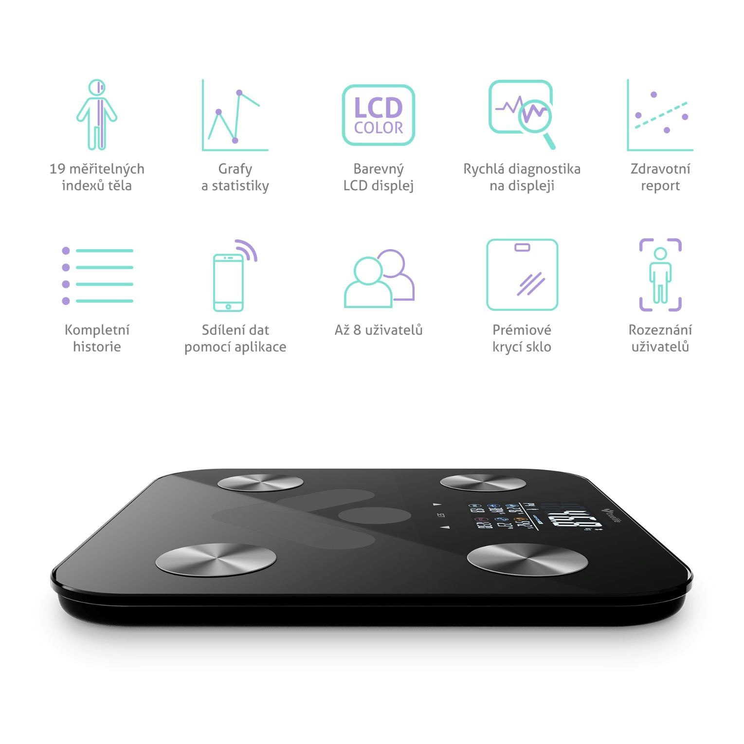 TrueLife FitScale W6 BT Black automaticky rozpozná8 používateľov, takže sa s rodinou alebo priateľmi môžete predháňať, kto dosiahne lepšie výsledky. Omnoho lepšie to ide s mobilnou aplikáciou, ktorú si stiahnete komplet v slovenčine a behom chvíle poznáte svoj kompletný reporting, porovnáte si údaje, prejdete si štatistiky a naštudujete popisy meraných indexov. Dáta môžete zdieľať s aplikáciami Apple Health Kit, Fitbit a Google Fit. Dokonalá je tiež možnosť nastavenia váhy pre váženie detí a možnosť nastavenia notifikácií a pripomienok váženia.