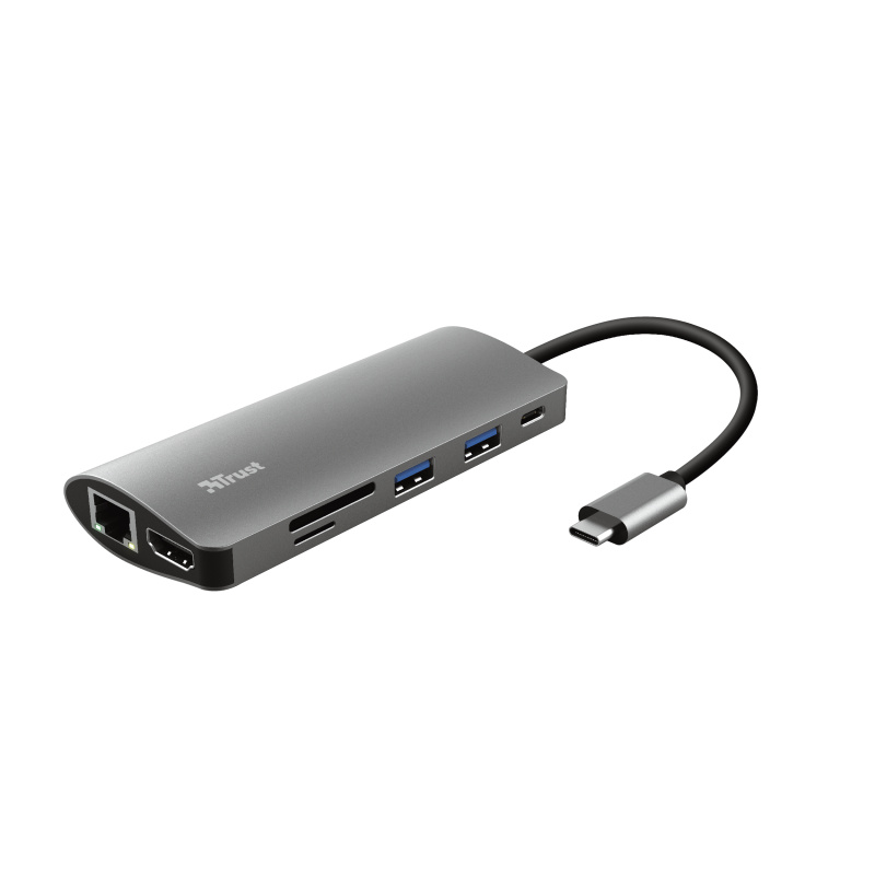 Trust Dalyx 7-in-1 USB-C Multiport Adapter. Stylový hliníkový víceportový adaptér pro přidání portů HDMI, sítě, čtečky karet, USB-C a USB do vašeho notebooku pomocí jediného připojení USB-C. Tenké notebooky jsou skvělé, ale jejich nedostatek portů pro připojení může být problém. S adaptérem Trust Dalyx 7 v 1 se vaše produktivita zvýší sedmkrát díky přiloženému připojení HDMI, Ethernet, paměťové karty, USB a USB-C.