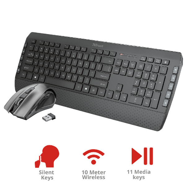 KLÁVESNICE *Nízkoprofilové klávesy s měkkým a tichým stiskem klávesy pro pohodlné psaní *Ergonomický design s pohodlnou opěrkou dlaní *Rozvržení v plné velikosti s numerickou klávesnicí a izolovanými tlačítky pro snadné čištění 11 kláves pro přímý přístup a 12 funkčních kláves *Sklopné nohy ke změně úhlu psaní *Až 10 m bezdrátový dosah *US layout