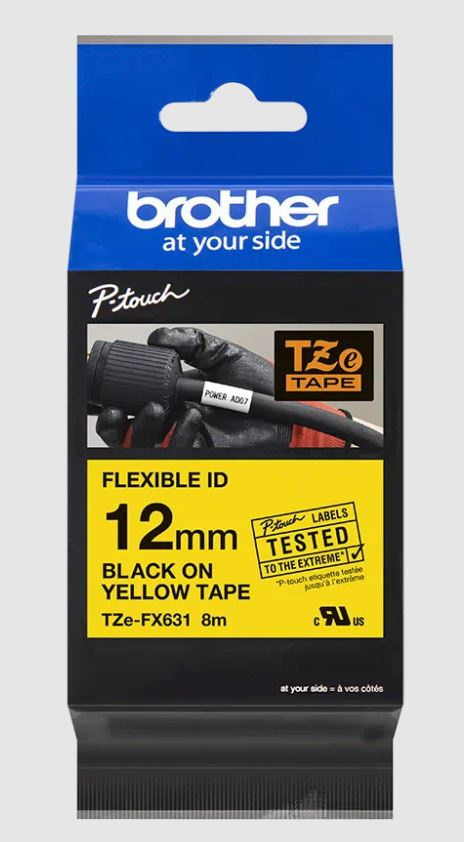 Ideální pro vytváření identifikačních štítků pro kabely, vodiče, PVC trubky nebo jiné válcovité tvary. Speciální lepidlo pásky Brother TZe-FX631 s černým tiskem na žlutém podkladu zajišťuje, že vaše důležité štítky budou mít dlouhou životnost. Kompatibilní s tiskárnami štítků P-touch, které mají logo TZ nebo TZe na krytu kazety s páskou.