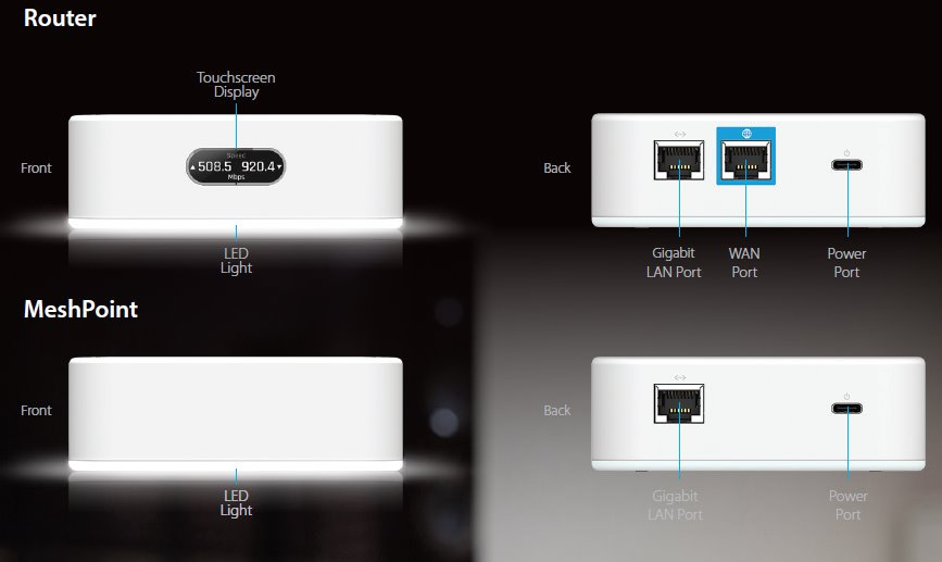 Router je vybaven jedním WAN portem a jedním LAN portem, oba 10/100/1000Mbps. Zařízení se napájí skrze USB-C konektor přiloženým zdrojem. WiFi část disponuje vysílacím výkonem 22dBm a modulačními rychlostmi 300Mbps (2,4GHz) + 867Mbps (5GHz) a podporovány jsou standardy 802.11a/b/g/n/ac.