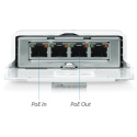 POE napájení Switch má celkem 4 porty z čehož 1. port je určen pro vstupní napájení pomocí 24V pasivního Gigabitového napájecího PoE adaptéru s podporou napájení po 2 párech. Zbylé 3 porty slouží pro napájení dalších zařízení s podporou 24V pasivního Gigabit PoE s podporou napájení po 2 párech (standard pro zařízení typu NanoStation, PowerBeam, AirGrid atd.). Maximální spotřeba na port je 24W, celková spotřeba všech 3 PoE portů je max. 24W.